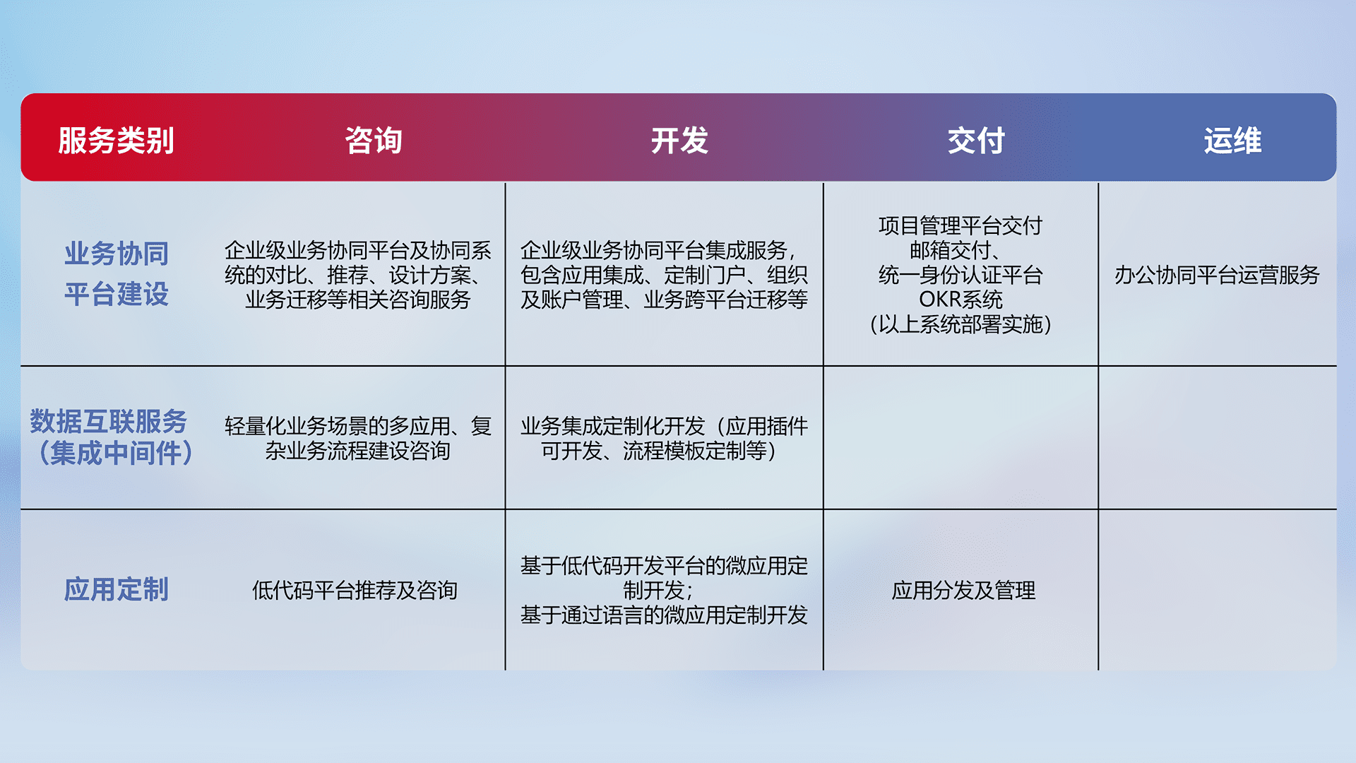 针对钉钉、、企微、、IDaas等平台级产品提供产品的规划、、、、方案、、交付、、、、定制化开发等服务,,,,实现如统一协同办公、、智能客户服务、、、混合会议管理、、、智能数据查询、、等业务场景,,,实现数字化转型。。